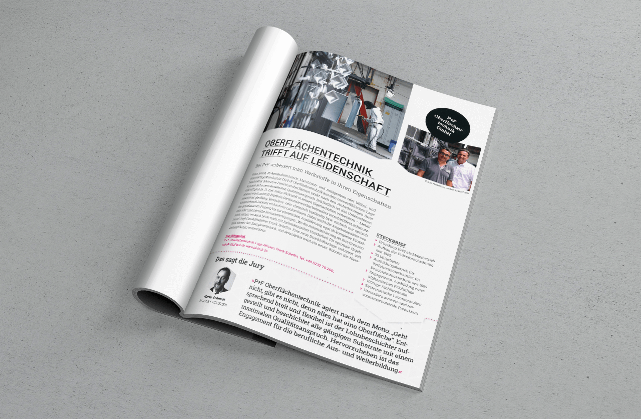 In der Kategorie Lohnbeschichter unter 50 Mitarbeiter zeichnete die Jury die P+F Oberflächentechnik aus. "Hier trifft Oberflächentechnik auf Leidenschaft", wie Redakteur Marko Schmidt in seiner Laudatio schilderte. Auf vier Lackierlinien beschichtet das Unternehmen dekorative Funktionsoberflächen exakt nach den Anforderungen seiner Kunden und setzt dabei erfolgreich einen maximalen Qualitätsanspruch um.